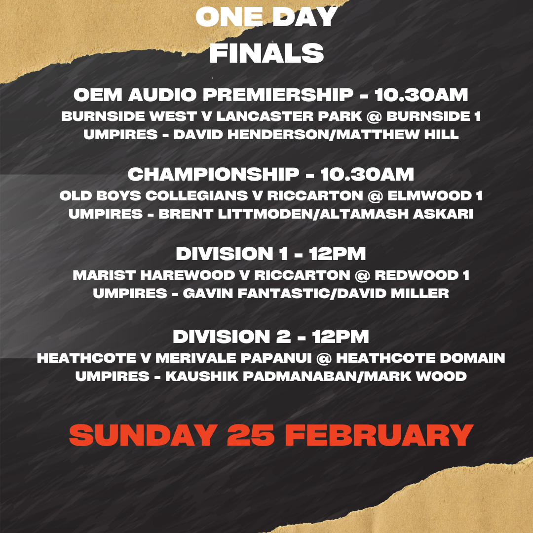 The OEM Audio NZ Premiership final is between the top two qualifiers with Burnside West hosting Lancaster Park. The top two from pool play in the Championship, Old Boys Collegians and Riccarton will meet in the final at Elmwood Park.